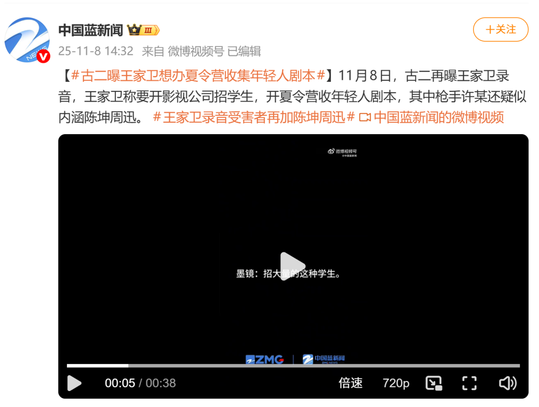 8日早些时候,据中国蓝新闻,“古二”再曝王家卫录音,王家卫称要开影视公司招学生,开夏令营收年轻人剧本,其中枪手许某还疑似内涵陈坤周迅。